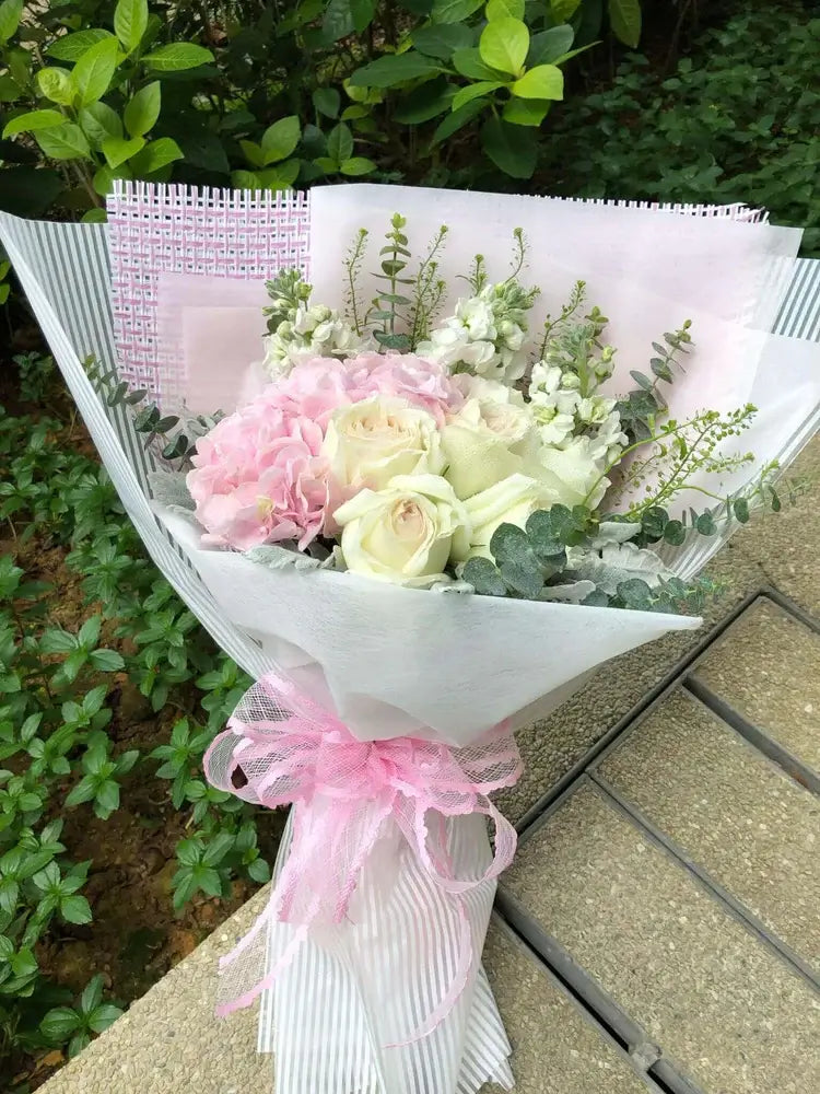 Featuring 5 cream roses with a pink hydrangea and accompanying foliage, this premium bouquet makes for a thoughtful gift for someone who appreciates pastel colours!