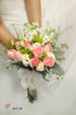 Featuring pink roses and white eustoma accentuated with green button pom, white mattiola and foliage, this free-form inspired bouquet symbolizes gentleness and harmony.