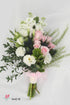 Featuring avalanche pink roses, white eustoma, white mattiola and eryngium amongst accompanying foliage, this free-form inspired bridal bouquet incorporates interesting elements alongside elegant classics.
